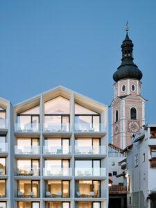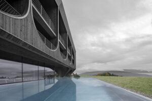 The project consists of three monolithic structures that resemble the original structure of the house before the remodelling. Taking into account the local context and surroundings, the strong architectural identity of the hotel follows a contemporary reinterpretation of the alpine style and plays with typical local elements such as the typical pitched roof.
