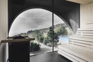 Tradition and culture are key elements in the design of the hotel. Simple and functional interiors with open-plan layouts are combined with local materials such as chestnut wood, local stone and textiles. The public areas such as the lobby, bar and restaurant are located on the ground floor. The bar opens onto a large, sunny terrace with impressive views of the Sciliar. The wellness facilities, spa and beauty centre are located in the basement.