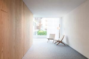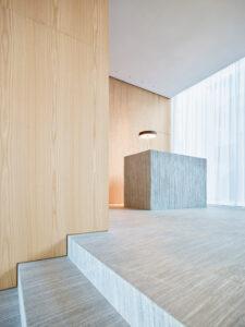 On the south façade, the tapering geometry has more depth and creates loggias with natural shading. The light grey colour of the chalky plaster on the façade is inspired by the rocks of the surrounding mountains.