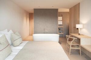 The rooms and suites are located on the upper floors and are characterised by a timeless design that creates a cosy atmosphere. Open-plan bathrooms with free-standing bathtubs invite you to take a soothing bath after a hike or ski tour.